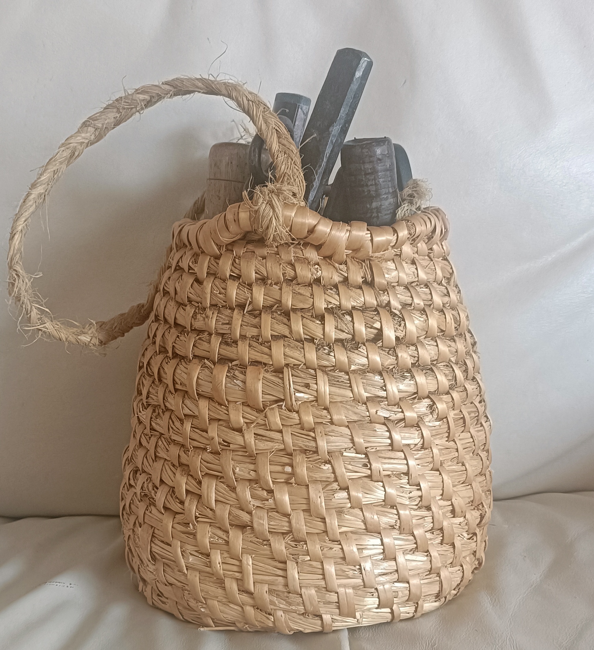 Aquesta peça, que s’elaborarà amb la tècnica de cosit en espiral, és una petita cistella rodona molt resistent ideal per dur eines de cistelleria. Fa un pam d’alçada aproximadament i uns 15 cm de base. Porta dues petites anses per passar-hi una corda.