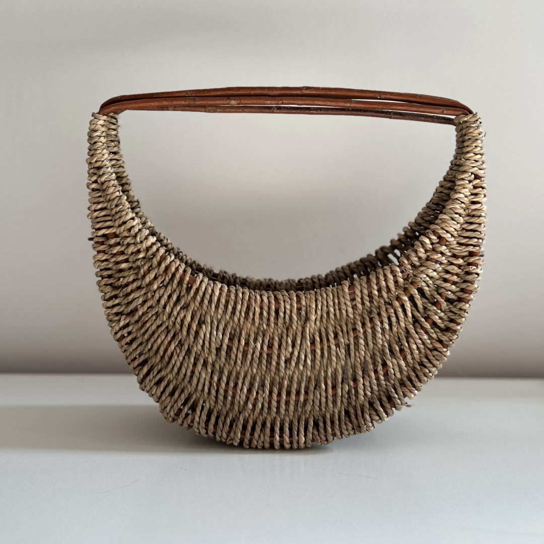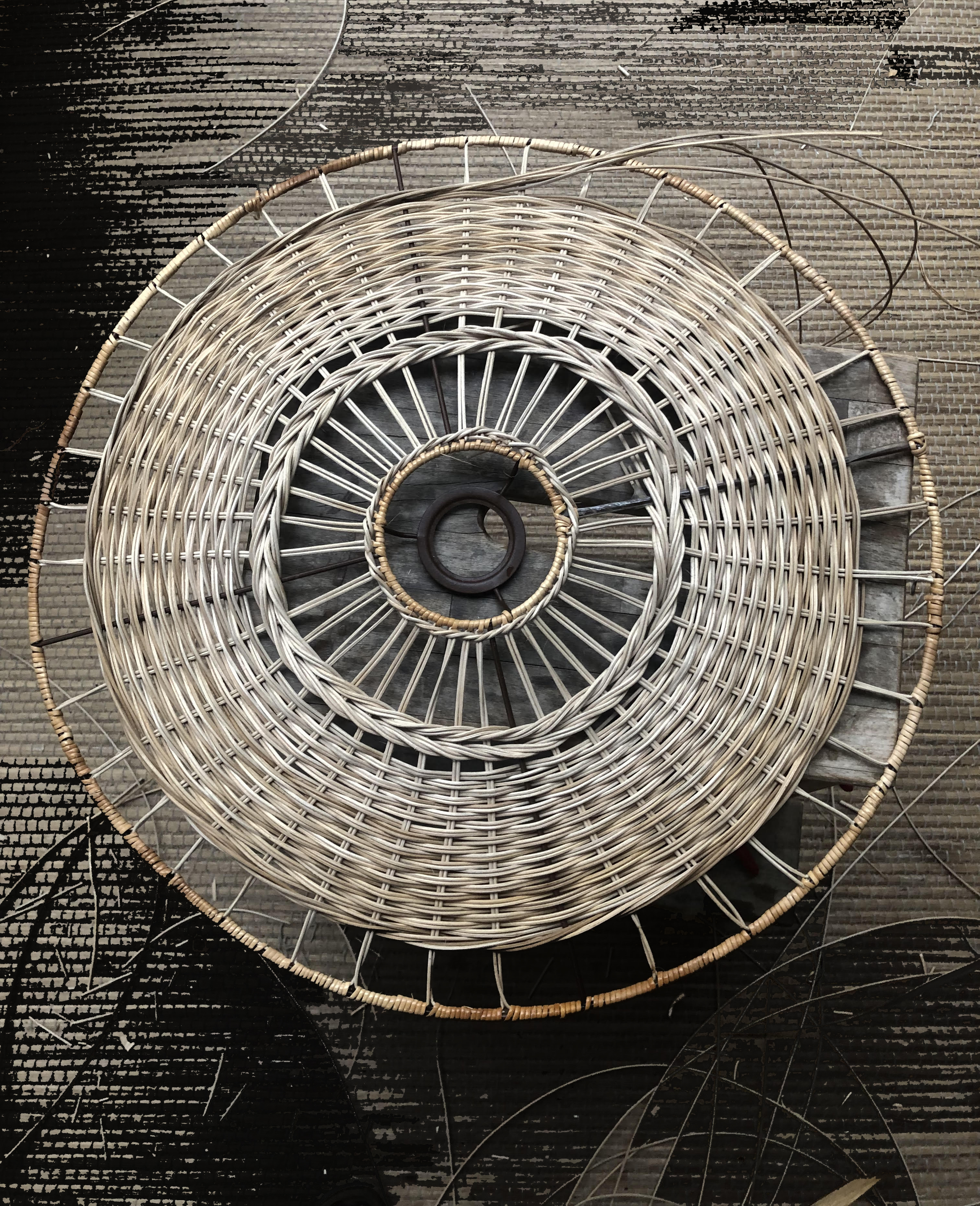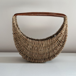 Aquesta peça és una reinterpretació del cistell de costelles. Es parteix d’una estructura formada per dues semiesferes de vímet gruixut que s’uneixen formant la nansa de la peça. Aquesta estructura de vímet es teixeix simultàniament per la dreta i l’esquerra de la nansa, en aquest cas amb alga marina (seagrass).