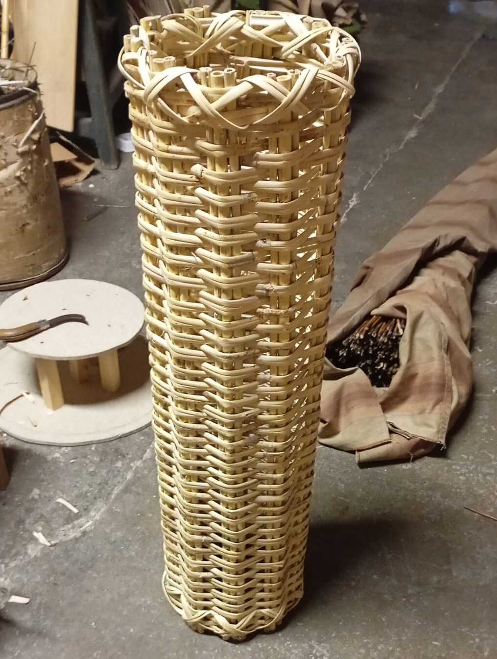 Farem un cove rodó gran per posar-hi llenya, roba, revistes etc. Amb aquesta peça explorarem la forma i el volum, així com diferents tècniques de teixit com el remolí de tres, el remolí de quatre, el teixit a mans, el teixit doble i el teixit anglès. Farem una vora plana i les nanses seran de vímet, o bé de cuir o cotó, segons l'experiència de cada participant.